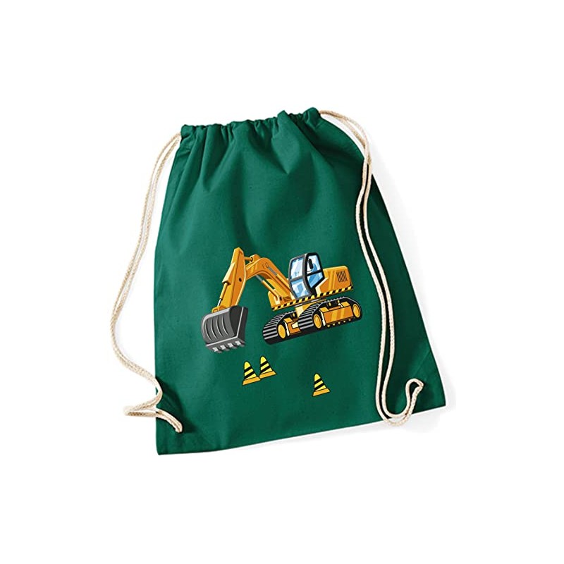 minimutz Gym Bag for Boys | Digger & Construction Site Motif | Cotton Drawstring Bag for Children | Drawstring Backpack, dark green