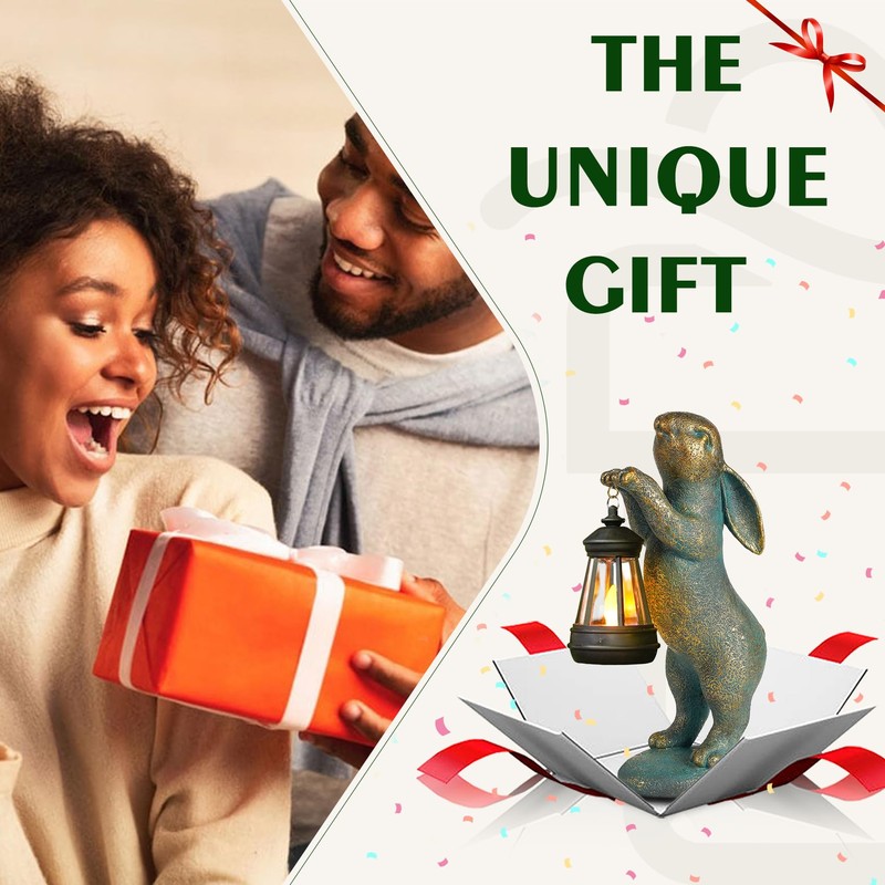 - Conejo con linterna solar: las estatuas de conejo de bronce sostienen una linterna solar, que emite un brillo cálido y acogedor. La luz imita una llama pequeña y vívida y parpadea en la brisa. Como símbolo de buena suerte, alegría y prosperidad, las cifras de conejo son ideales para crear un ambiente cálido en el patio, patio y porche.