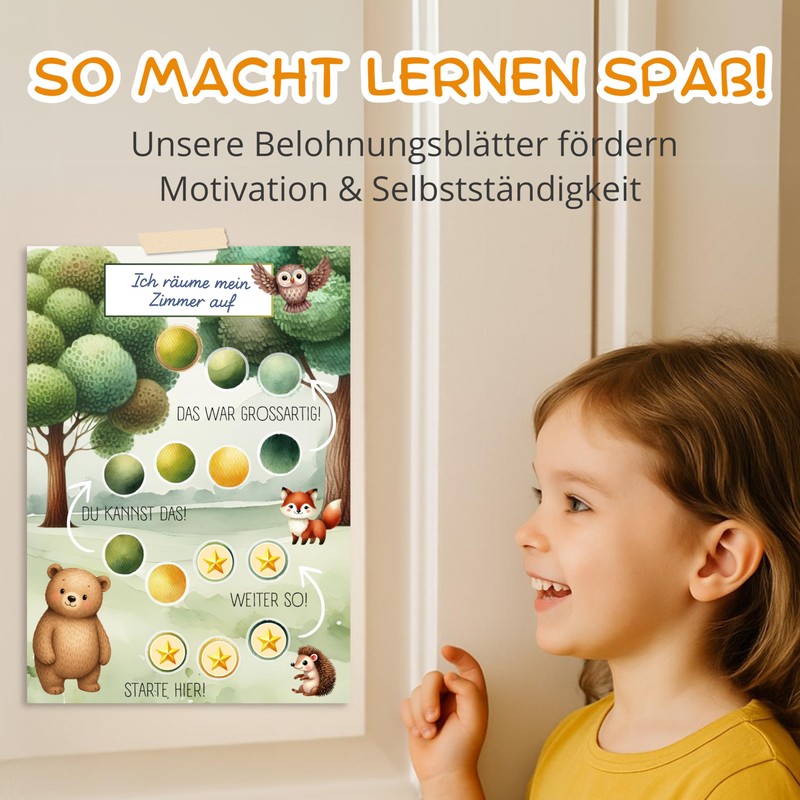 MINITALES Children's reward board - 10 lovingly designed reward sheets with stickers. Small successes, big effect - The MINITALES reward board for children helps build good habits playfully. Whether brushing teeth, dressing, being friendly or potting the first course: with each sticker the motivation grows. Our reward sheets are versatile - as a daily planner children's routine, chore board, weekly planner, routine planner or even as a stamp card for children - ideal for home, daycare or school. Advantages at a glance: Motivational reward system for children – promotes positive behaviour in everyday life: be friendly, complete tasks, adhere to routines. Flexible and age-appropriate - Suitable as a reward board children from 3, but also for children from 4, 6 or 8 years - without pressure, but with lots of joy. Also suitable for potty training - use the stickers as a potty reward or to help with the toilet routine. Lovingly designed & easy to use - No prior knowledge required: the child-friendly sheets are ready to use and work without complicated rules. CONVENIENT SET OF 10 - Includes 10 A4 reward sheets with colourful stickers - perfect for several weeks of motivation and visible progress. With the MINITALES children's reward board, small progress becomes big moments - a thoughtful reward system that supports parents in everyday life and gives children joy of growing.