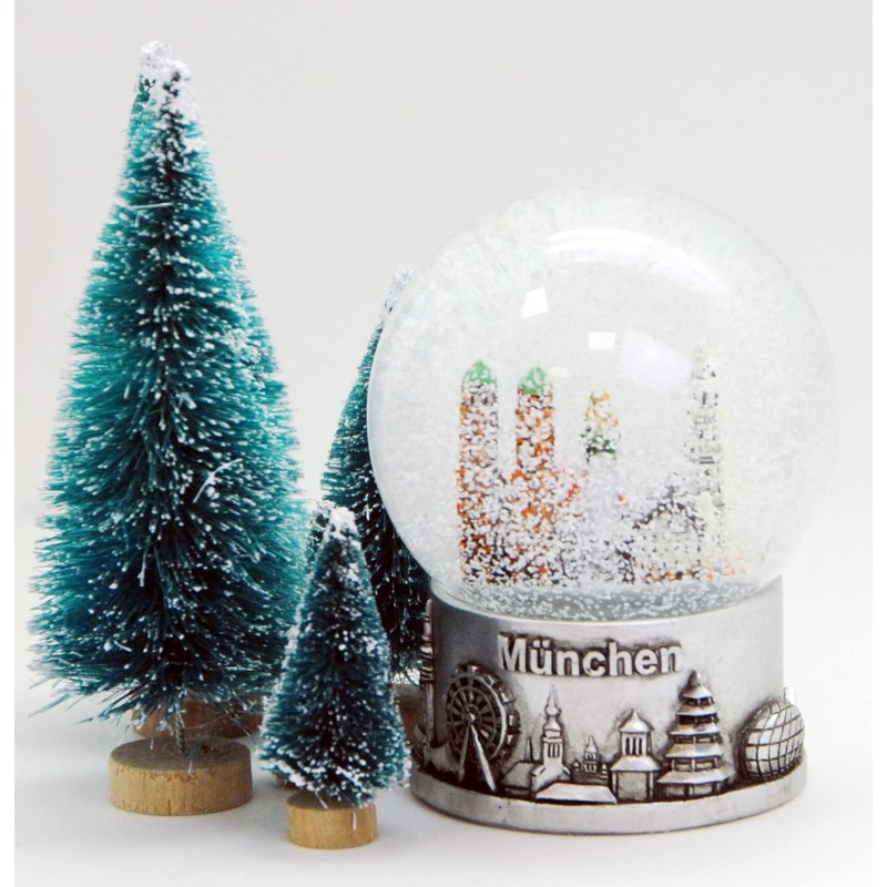 - Souvenir snow globe for Munich with silver embossed base with the skyline of Munich. The ball contains the town hall, the Mariensäule and the Frauenkirche. The base is anodised silver and designed with the Munich skyline.