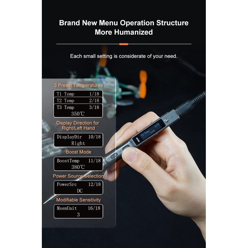 MINIWARE Smart Soldering Iron TS101 ist eine verbesserte Version des Mini-Löteisens TS100. Basierend auf dem TS100 wurde der TS101 in Leistung und Funktion verbessert und optimiert, um die Benutzerfreundlichkeit zu erhöhen. Die Steuerung des TS101 hat ein scharfes und robustes Aussehen und verwendet einen größeren OLED-Bildschirm mit 128*32 Pixeln, um mehr Heizdaten anzuzeigen. Die klassische A-B-Tasten-Bedienung führt die TS100-Bedienungsgewohnheiten fort und reduziert den Lernaufwand für den Benutzer. Die Lötspitze wird mit einer Kugelumlaufspindel fixiert, ohne dass die Sechskantschraube vor dem Einsetzen oder Entfernen der Spitze gelöst werden muss. Ein neues bequemes und praktisches Zubehör - eine Antirutschkappe, die wie ein Katzenkopf aussieht, kann nicht nur als einfacher Ständer verwendet werden, um den Lötkolben zu stützen und ihn vor dem Wegrollen zu bewahren, sondern auch, um die Finger vor dem Abrutschen zu schützen und die Lötspitze zu entfernen.