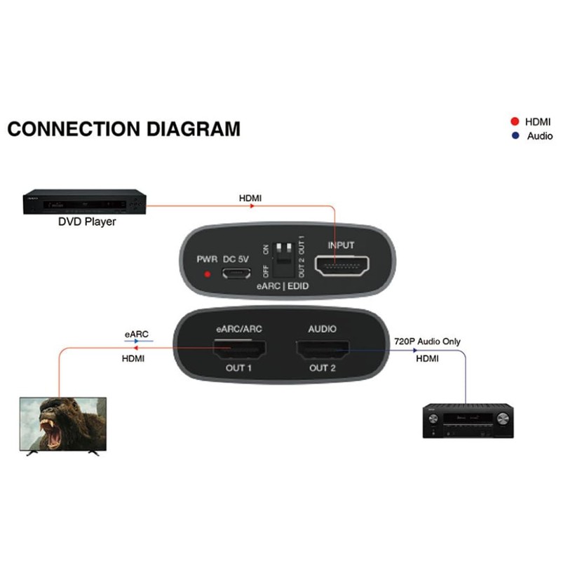 Introduction The 18Gbps HDMI eARC audio extractor supports dedicated HDMI output for extracting audio only. It allows user to use the existing AV Receiver to receive 4K2K@60Hz, HDCP 2.3 content audio. The product also supports HDMI loop out, as well as 10bits HDR (High Dynamic Range) pass-through and eARC/ARC.