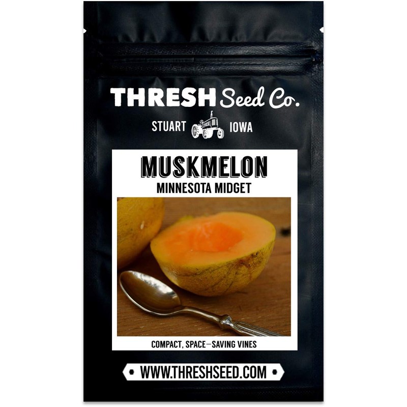 (Cucumis melo) Minnesota Midget is absolutely the best choice if you are working with limited garden space. Its compact vines reach just 3-4' in length while producing 6 to 8 melons each! Pictured above you can count at least 5 melons in about four square feet. The melons are smaller, about 4-6" across, but they pack a lot of flavor. Picked at their peak, they boast intense sweetness and juiciness. All around, this is an awesome variety. 60-70 days to harvest. 25 seeds per packet. CULTURE: Direct sow seeds outdoors 2 weeks after last frost, once soil temps have reached 70 degrees. Sow 3-5 seeds per hill with 2 to 4 feet between hills and to 3 to 4 feet between rows. Under ideal conditions germination will occur in 5-8 days. Melons are ready to harvest once the melon "slips" from the vine when gently tugged. Don't leave them too long, however, as ripe melons have a sweet aroma that attracts insects.