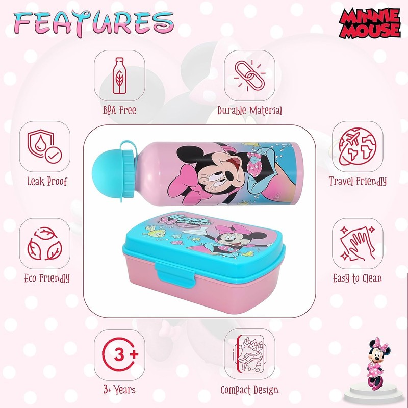 - THE PACKAGE INCLUDES: Customers will get Minnie Mouse character print 1x kids sports water bottle and 1x plastic lunch box. Making it an exciting accessory for kids aged 3+ and encouraging them to enjoy their meals and stay hydrated throughout the day.