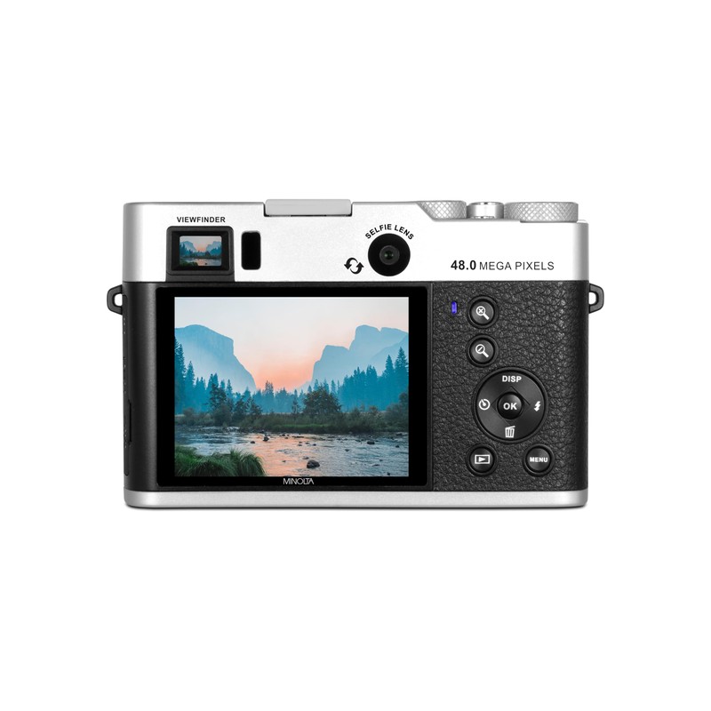 Minolta MND70 Retro 48 MP Autofocus Digital Camera with 5K Ultra HD Video, Rear Selfie Lens & WiFi, Silver