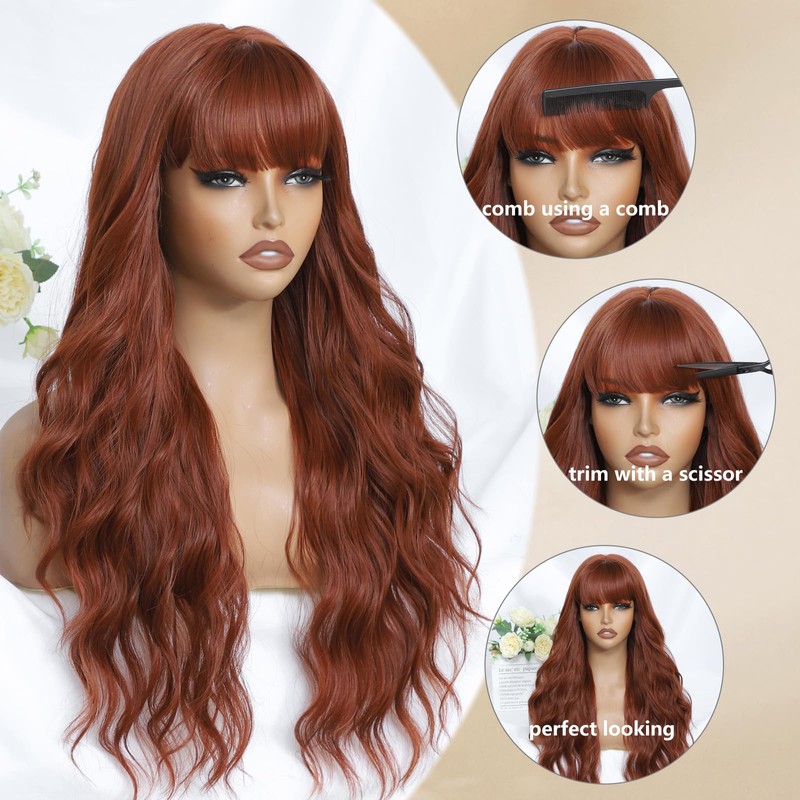 - 【Long Auburn Hair Wig】This auburn wavy wig is long wig with bangs that frame your face perfectly, the full bangs add a perfectly feminine touch,while the wavy hair lend a beachy look that certainly won't miss the target