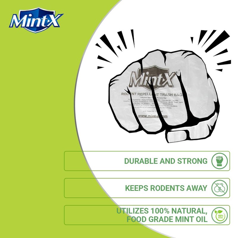 - Botanically-Derived Active Ingredients: Mint-X rodent repellent trash bags feature a blend of plant-derived essential oils that eliminate the problem of foraging rodents near the garbage site