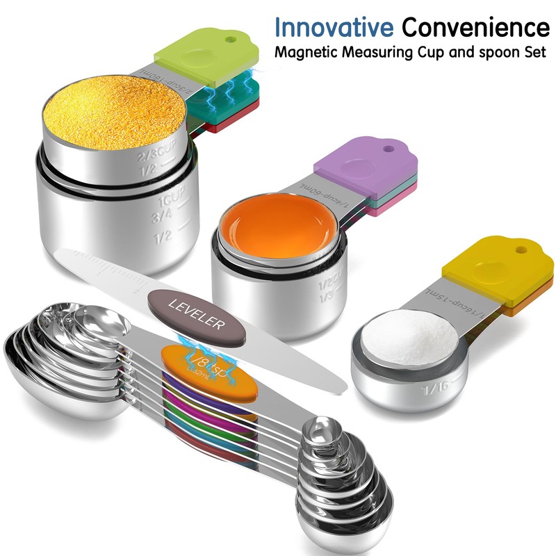 - Complete Baking Solution - Minteem stainless steel magnetic measuring cups and spoons set includes 8 cups (1/16cup, 1/8 cup, 1/4 cup, 1/3 cup, 1/2 cup, 2/3 cup, 3/4 cup, 1 cup), 7 spoons(1/8 tsp, 1/4 tsp, 1/2 tsp, 3/4 tsp, 1 tsp, 2 tsp, 1 tbsp), 1 leveler, making it your go-to baking solution for precise measurements.