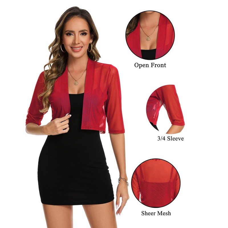 - ❤️ Design & Style: This lightweight cardigan features a semi-sheer, open-front design crafted from stretchy mesh fabric. The 3/4 sleeves and short bolero length make it ideal for layering over casual or formal outfits, adding a touch of elegance to your look.
