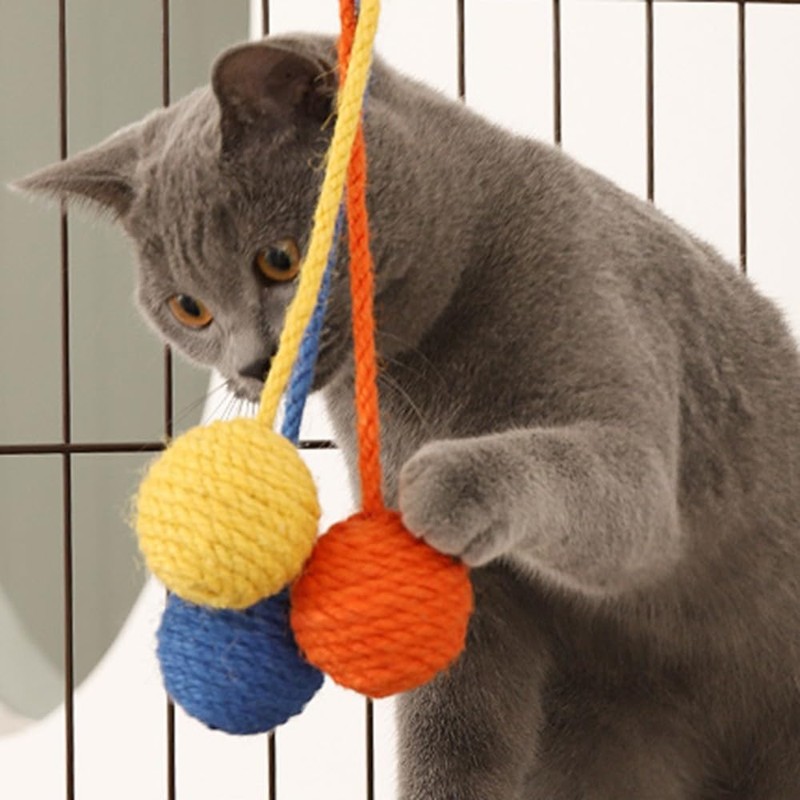 - SPECIFICATION: This product contains 3 sisal balls in 1 string, with different colors to choose from, you can choose according to your preference, to enhance the interaction with the cat play, grinding teeth and scratching, relieve anxiety and boredom.