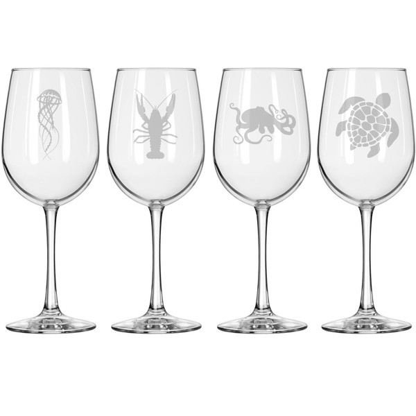 MIP Set of 4 Wine Glass for Red or White Wine Gift Sea Ocean Life Collection One (16 oz Tall Stemmed)