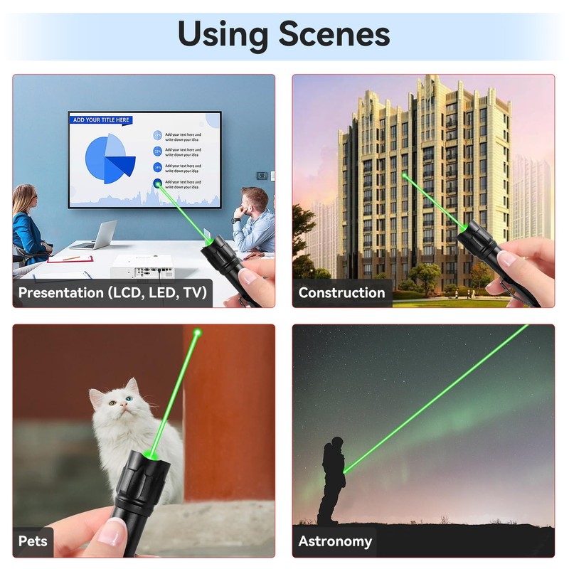 - [Starlight Pattern] Press down the star cap and rotate it to remove the star cap, then you can see a straight green light in the dark, and you can see different starlight patterns when you install the star cap. You can use it in many situations, such as construction sites, outdoor adventures, classrooms, meeting presentations, and other fun uses.[002]