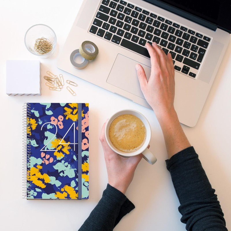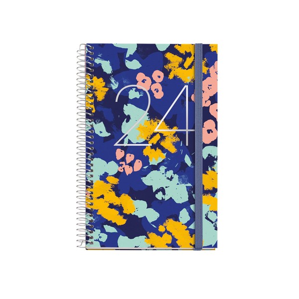 Miquelrius - 2024 Week to View Diary Active Size 117 x 182 mm Hardback Spiral Bound Rubber Closure Spanish English and Portuguese Flowers with Silver Stamp