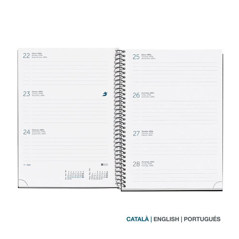 • 2024 Week to View Horizontal Year Planner (January 2024 - December 2024). Table Size: Plus 155 x 213mm (similar to A5) Languages: Catalan, English and Portuguese.