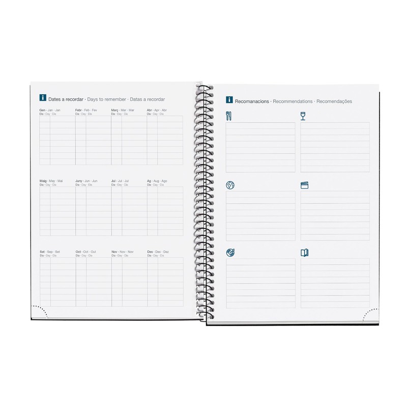 • Includes: festivals of Catalonia and its capitals of the province, Spain and Portugal. Symbols: time change, starting stations, Chinese New Year. Memo sheets, address sheets and personal information sheets.