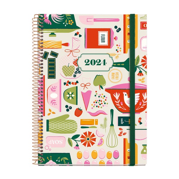 Miquelrius - 2024 Year Planner Week to View Plus Size 155 x 213mm (A5 Similar) Hardback Spiral Bound Elastic Band Catalan, English & Portuguese Sweet Home