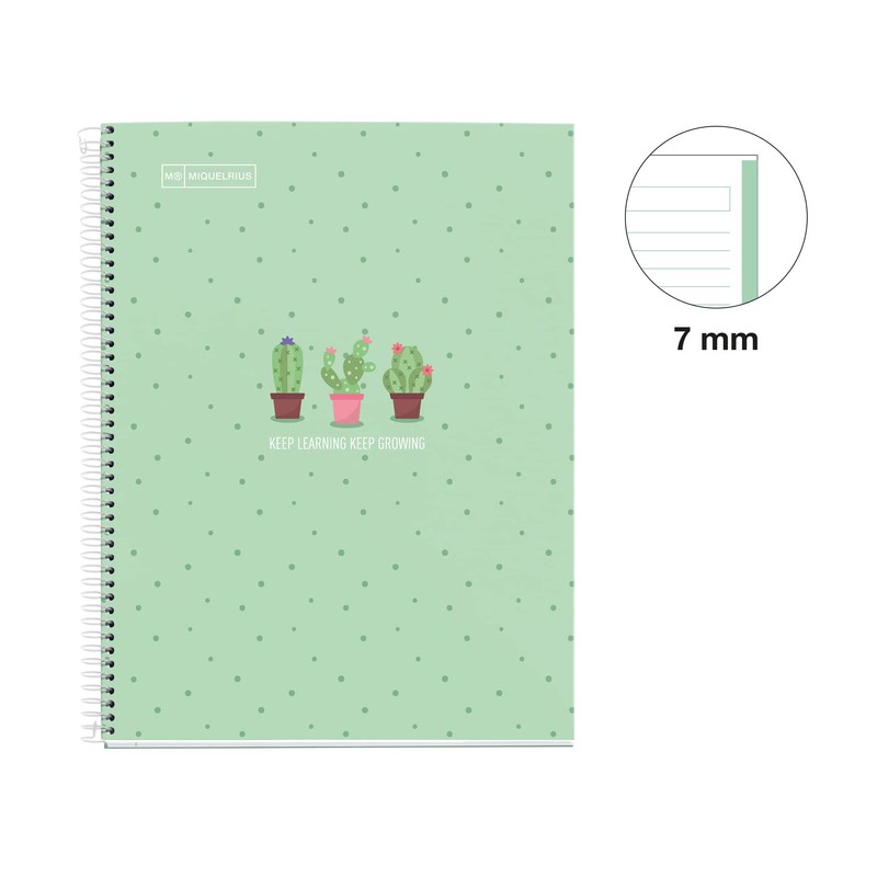 Miquelrius - A4 Notebook, 1 Colour Strip, 80 Sheets 7mm Horizontal Ruled, 90g Paper, 4 Holes, Hard Laminated Cover, Mint Cactus