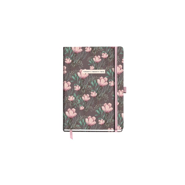 - Rigid cover made of matt plasticized cardboard with flowers and insects design and mint background. Sewn COUNTERNATION. ELASTIC RUBBER and rubber pen holder, both lilac. Inner pocket with bellows.