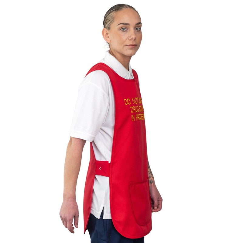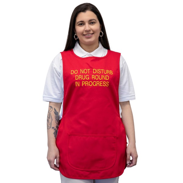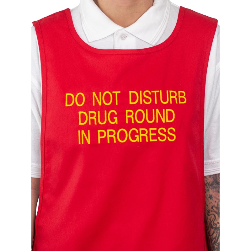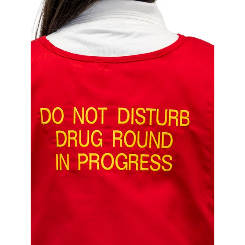 - Bright red tabard with bold yellow embroidered text reads, "DO NOT DISTURB DRUG ROUND IN PROGRESS".