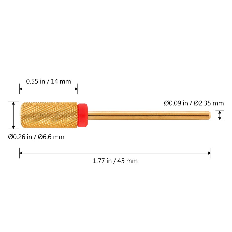 • Quantity: 1 piece | Color: Gold | Grit: Extra Fine | Shank size: 3/32" (2.35mm) | Head: ∅0.26in (6.6mm) x 0.55in (14mm) | Overall Length:1.77in (45mm)