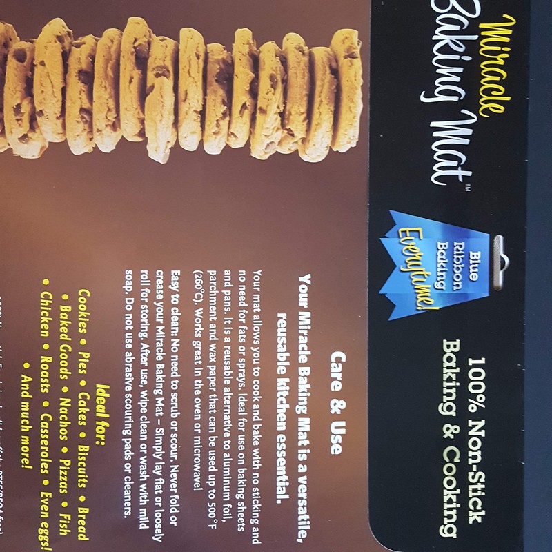 Miracle Baking Mat Perfect Baking Every Time The Miracle Baking Mat is a versatile, reusable kitchen essential. The Miracle Baking Mat allows you to cook and bake with no sticking and no need for fats or sprays. Ideal for use on baking sheets and pans. It is a reusable alternative to aluminum foil, parchment and wax paper that can be used up to 500°F(260°C). Works great in the oven or microwave! Ideal for: Cookie * Pies * Biscuits * Bread * Baked Goods * Nachos * Pizzas * Fish * Chicken * Roasts * Casseroles * Even eggs! * And much more! 100% Non-stick: Food simply glides off the PTEE (PFOA free) coated non-stick fabric. Includes - 1 Miracle Baking Mat Measures 13" x 15.75"