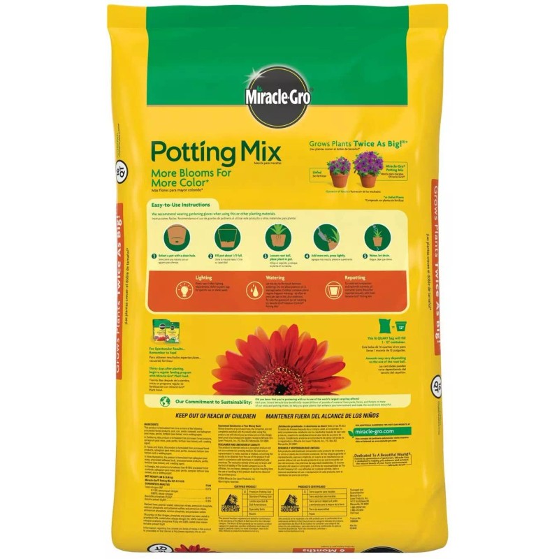 Miracle-Gro Potting Mix, 16 QuartGive your plants the color they want to show off with Miracle-Gro Potting Mix. Our specially formulated mix will feed your plants for up to 6 months and grow them bigger and more beautiful. Use it with outdoor and indoor container plants, and let Miracle-Gro Grow Plants twice as big (versus unfed plants).