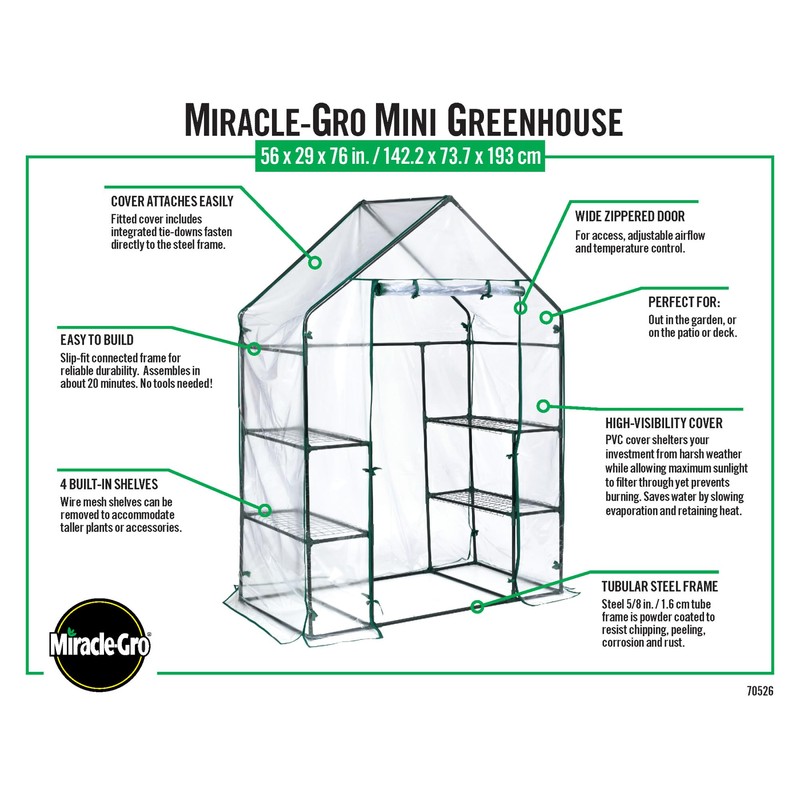 The Mini Walk-In Greenhouse from Miracle-Gro helps you grow healthy, hearty plants easier and faster. Use this portable greenhouse in your backyard or patio to give your plants, herbs, vegetables, or flowers superior protection from harsh weather and other elements. The included 4 wire mesh shelves increase capacity and are removable to accommodate taller plants and accessories. It's an ideal shelter to start growing seedlings earlier or extend your growing season. Its portability makes it easy to use anywhere in your yard or nursery. Its quick-snap frame takes about 15 minutes to put together, and the clear PVC cover ties down to resist flapping for a neater appearance. The cover allows the maximum amount of light to reach your plants, even in cooler months and features a double-zipper door that provides easy access. This durable cover also protects your plants year round, making it an all-season greenhouse. This compact outdoor greenhouse is a great garden accessory whether you're a DIY hobbyist or professional grower. The frame is 5/8" high-grade tubular steel with a powder coat finish to resist chipping, peeling, rust, and corrosion for long-lasting use. Perfect to protect your veggies, flowers, and plants from pests, rabbits, deer and other animals. The compact design measures 28.4" D x 56" W x 76" H fully assembled and breaks down for easy storage.