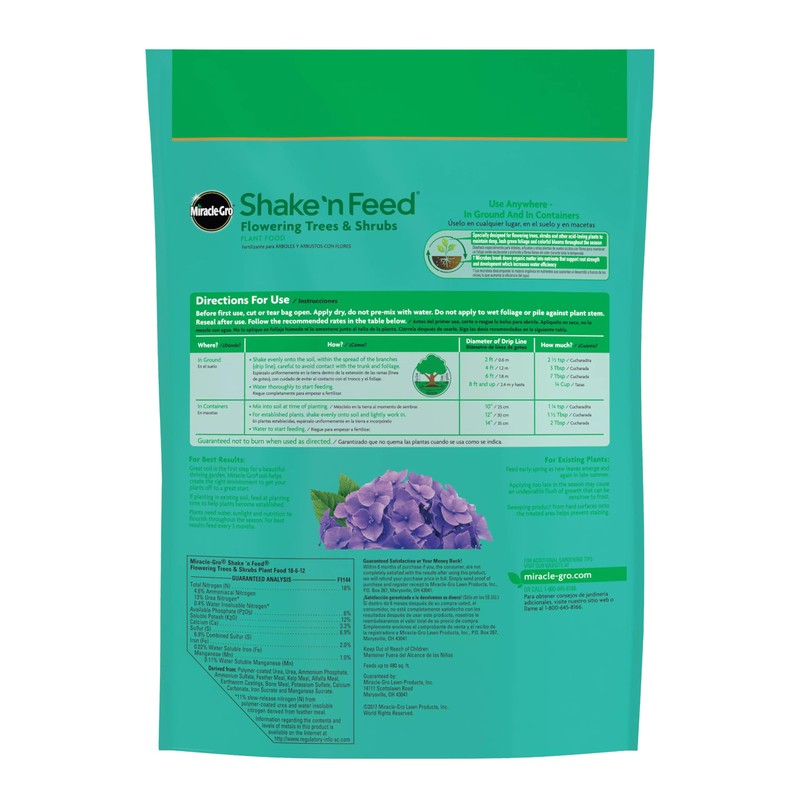 Miracle-Gro shake 'N feed flowering trees & shrubs plant food contains vital micronutrients, Plus added natural ingredients, to nourish above & below the soil. It has been formulated with kelp, earthworm castings, feather meal & bone meal in an all-in-one particle to feed microbes in the soil. Microbes break down organic matter into nutrients that support root strength & development which increase water efficiency. Specifically designed for flowing trees, shrubs & other acid-loving plants to maintain Deep, lush green foliage & colorful blooms throughout the season. You can use it anywhere: in ground & in containers. You can feed your plants forup to 3-months with the help of Miracle-Gro shake 'N feed flowering trees & shrubs plant food.