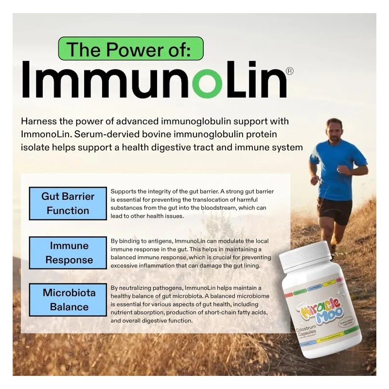 Descubre el poder del calostro bovino Miracle Moo, un suplemento natural en cápsulas formulado para apoyar tu sistema inmunológico, promover la recuperación muscular y mejorar tu salud general. El calostro bovino es conocido por ser una fuente rica en anticuerpos, factores de crecimiento y nutrientes esenciales que fortalecen las defensas del cuerpo y favorecen el bienestar integral.