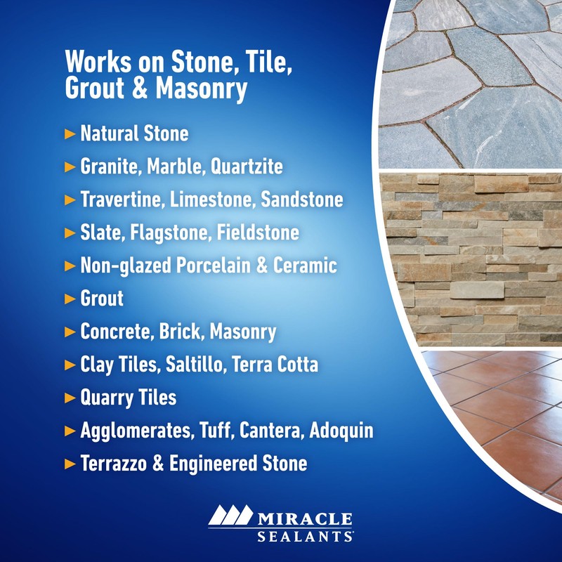 Product DescriptionMiracle Sealants 511 Seal & Enhance is a ready to use, surface impregnator and enhancer designed to protect stone and tile. Eliminates the need for multiple step application to renew the look of granite, marble, natural stone, slate, limestone, quarry tile, grout and more. 511 Seal & Enhance will not yellow and works best on hard surface floors including tile and stone floors to provide durable protection for interior and exterior surfaces. One-Step Sealer & Enhancer Ready to Use Solvent Base Impregnator/Color Enhancer For: ? Granite ? Limestone ? Marble ? Ceramic Tile ? Polished Stone ? Natural Stone ? Quarry Tile ? Slate ? Grout ? Not for Concrete/Masonry 511 Seal & Enhance Is a unique, solvent-base formula designed to eliminate the need to use an impregnator before using a color enhancer for maximum stain protection and superior color enhancement. 511 Seal & Enhance is safe for use on granite, marble, limestone, natural stone, slate, ceramic tile, quarry tile and grout surfaces. 511 Seal & Enhance will enhance the color and rejuvenate the appearance of tumbled, honed, acid-washed, sandblasted, flamed, textured, even polished stone and tile surfaces. In addition, 511 Seal & Enhance revitalizes old and worn stone and tile installations. It can be used successfully in both interior and exterior environments and is freeze/thaw resistant. SPECIAL FEATURES: ? Superior Stain Protection ? Interior/Exterior ? One Step ? Oil Resistant ? Water Repellant ? Will Not Yellow ? Enhances Color ? Grout Release ? Easy To Use ? Lasts 3 - 5 Years ? Good for Floors Coverage: Approximately 250 - 4,000 square feet per gallon.From the Manufacturer511 Seal and Enhance is a unique, solvent-base formula designed to eliminate the need to use an impregnator before using a color enhancer for maximum stain protection and superior color enhancement. 511 Seal and Enhance is safe for use on granite, marble, limestone, natural stone, slate, ceramic tile, quarry tile, grout, concrete and masonry surfaces. 511 Seal and Enhance will enhance the color and rejuvenate the appearance of tumbled, honed, acid-washed, sandblasted, flamed, textured, even polished stone and tile surfaces. In addition, 511 Seal and Enhance revitalizes old and worn stone and tile installations. It can be used successfully in both interior and exterior environments and is freeze/thaw resistant.