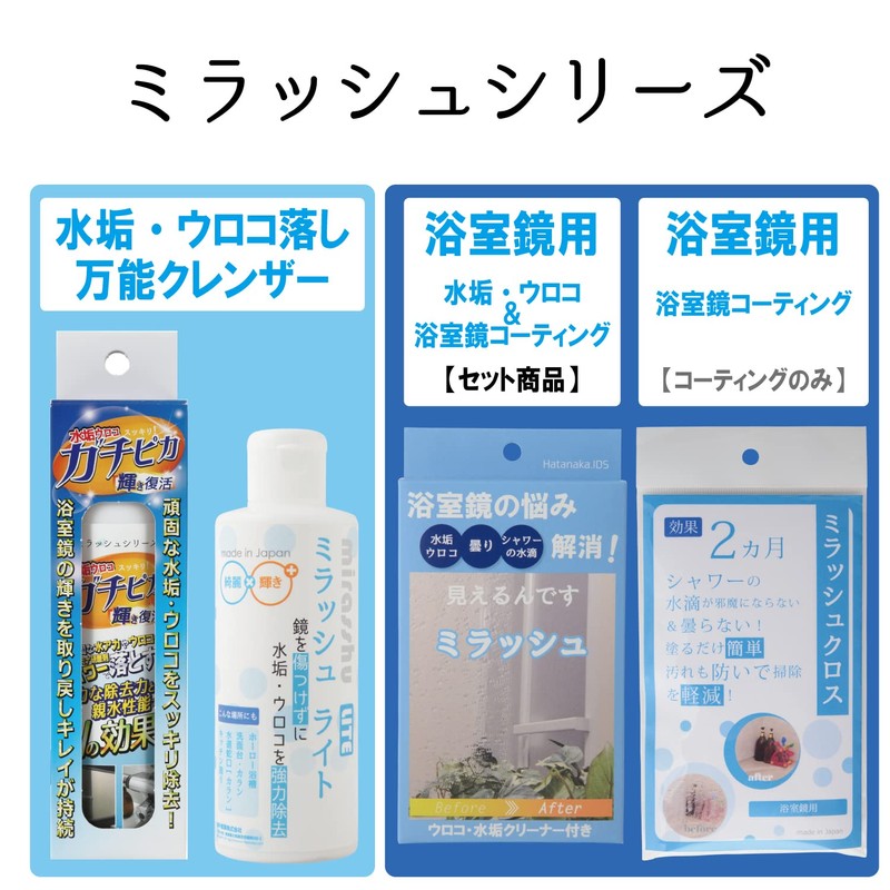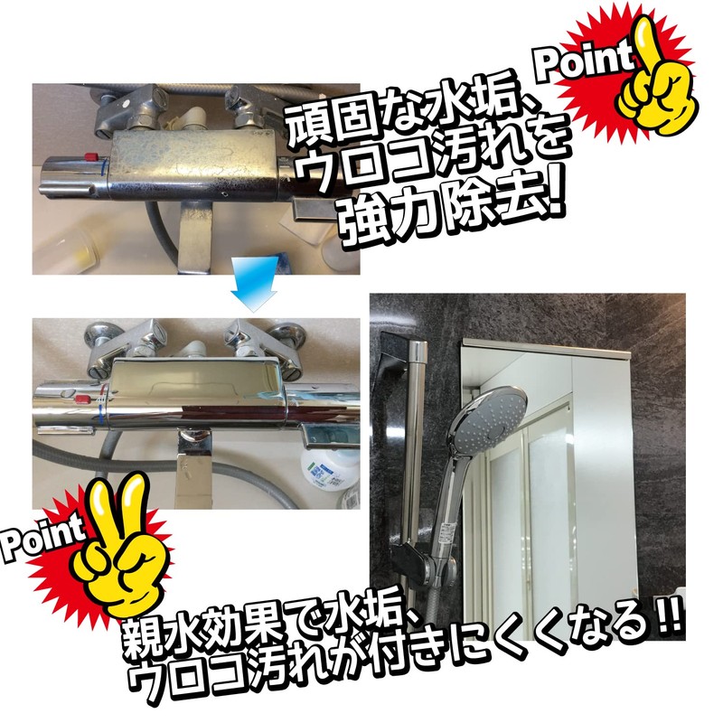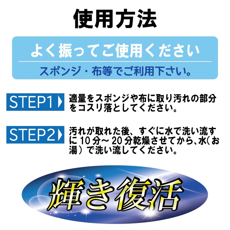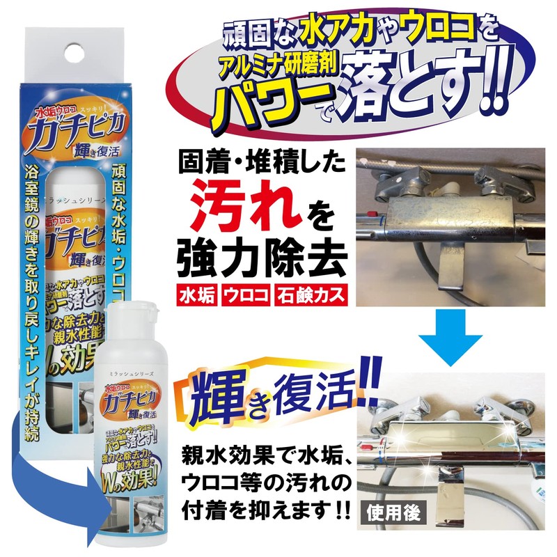 ●酸性ではなく研磨剤と相性が良いアルカリ性のクレンザー。●素地を傷付けないギリギリの大きさのアルミナ鉱物(4.8μ)を採用しており対象物への「やさしさ」をキープしつつ、頑固な水垢・ウロコ等の汚れの除去力を大幅に上げました。●更に、ミラッシュシリーズの親水性効果(約1ヶ月以上)も同時に発揮出来るオールラウンドクリーナーです。【注意事項】●皮膚の弱い人は被れる恐れがある為、保護手袋を着用して下さい。●人体に害がある為吸引したり飲んだりしないで下さい。●眼に入ると障害が生じる恐れがある為保護眼鏡を着用して下さい。●換気の良い場所で使用して下さい。●子供の手の届く所には置かないで下さい。