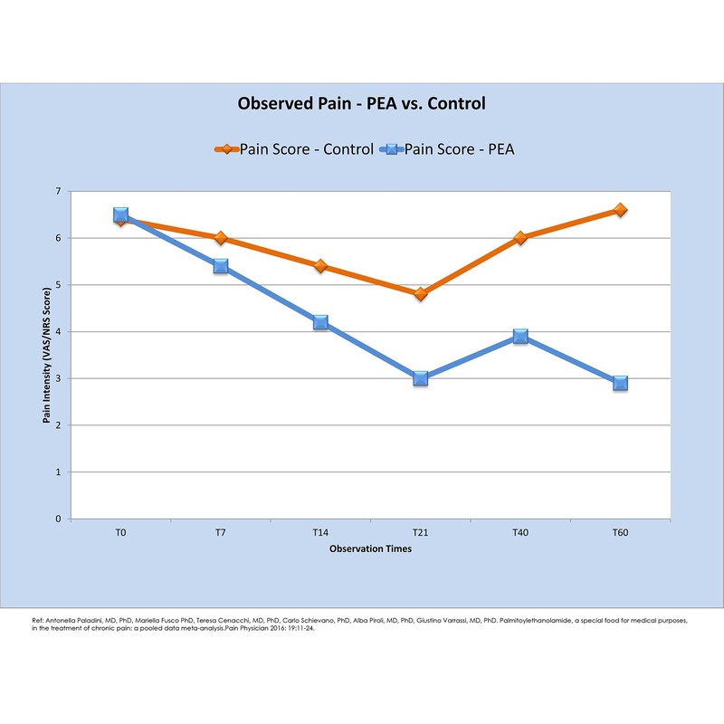 In a recent meta-analysis of PEA involving a total of 1484 chronic pain patients, those taking PEA reported pain levels an average of 2.7 points lower than the control groups after 60 days.* (Paladini 2016)