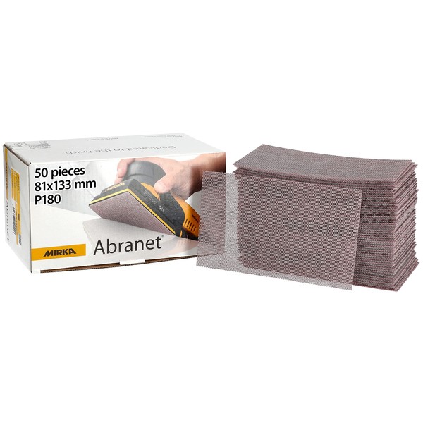 - Included in delivery: Mirka Abranet net sandpaper strips 81x133 mm, grit P180, 50 pieces per package. Suitable for matching orbital sanders, hand sanding blocks and hand sanding.