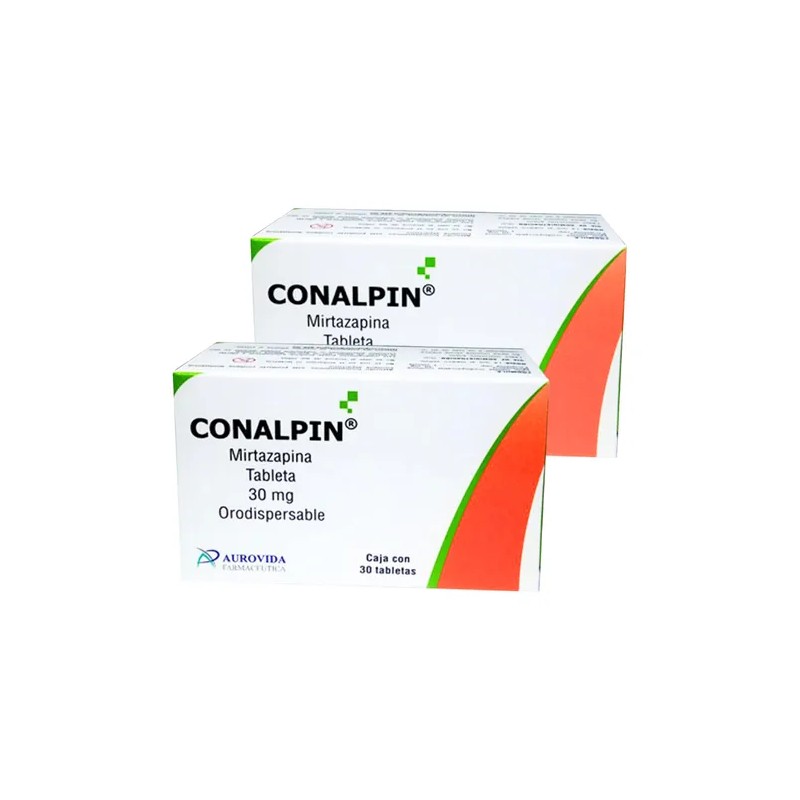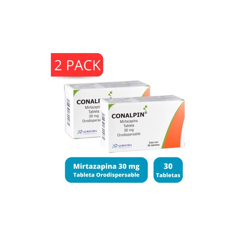 Conalpin (Mirtazapina) 30 mg, tabletas orodispersables, presentadas en un conveniente 2 pack, con 30 tabletas en cada caja, fabricado por Aurovida Laboratorios. Este medicamento cuenta con el registro sanitario COFEPRIS: 109M2016 SSA IV, garantizando su seguridad y eficacia. Este paquete es un total de 60 tabletas.