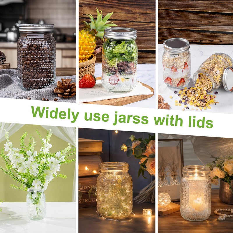- VERSATILE USES: mason jar with lid is perfect for storing berries, salads, ,overnight oats,fruits, pickles, yogurt, meal prep and preserves. Unleash your creativity by decorating these airtight glass jars for party lights or gifting homemade cookies to friends and family.
