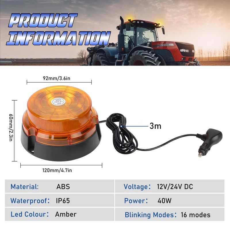 - Super bright: 45 high intensity LED chips, Bright amber beacon lights is easily seen in rain, fog and snow, visible during the day and night.