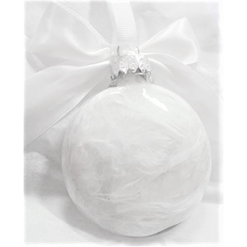 "I Carried You Every Second of Your Life and I will Love You Every Second of Mine." is printed on beautiful creamy vellum and placed inside the ornament. Beautiful white feathers are placed behind the vellum to show through the back of the glass and then the ornament is topped with a hand-tied White Deluxe Satin Bow and a silver-tone footprints heart charm dangles from the neck.