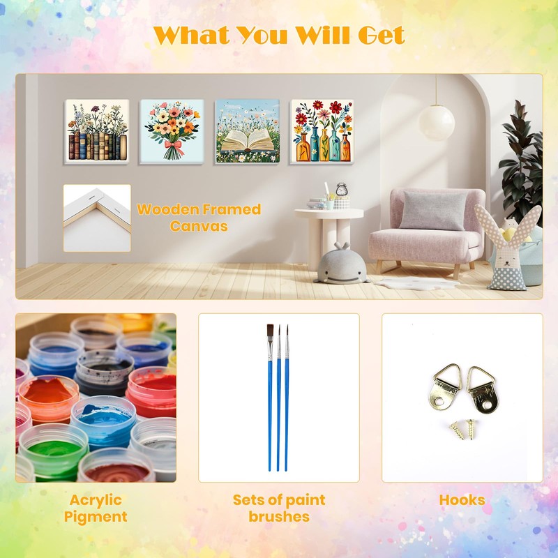 - What You Get: Kids paint by number comes with everything you need. 4 digital painting kits including pre-printed textured art canvas (unframed), 8 high-quality paintbrushes.