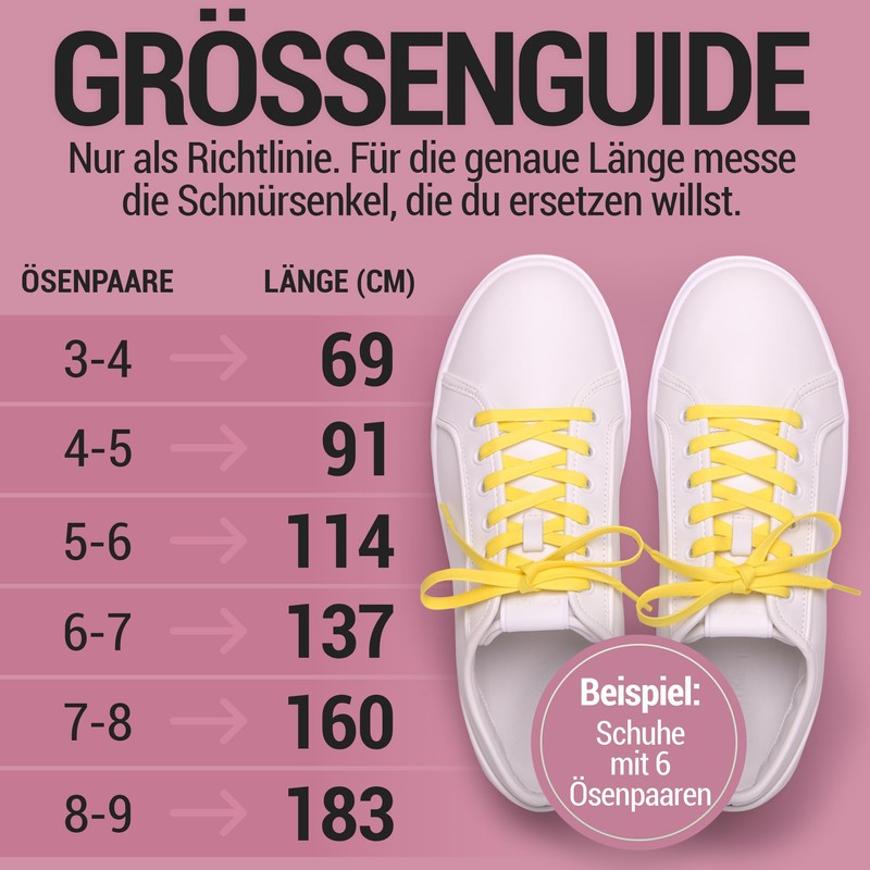 - Find your length: available lengths from 69 to 183 cm. For the best fit, measure your current laces or check our size chart in the pictures