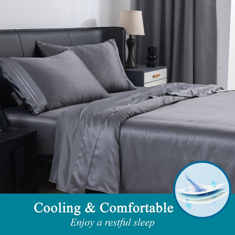 MISERRO Twin Sheets - 100% Satin Bed Sheets Set - 3pc Silk Like Cooling Sheets for Twin Size Bed - 16" Deep Pocket (Twin, Darkgrey)