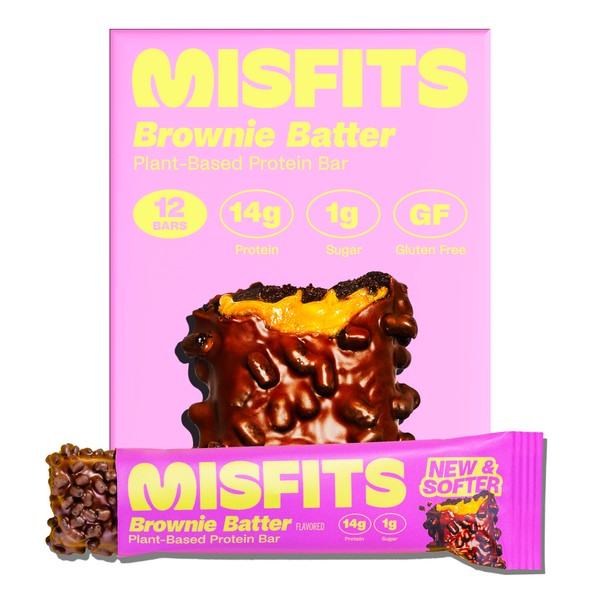 Misfits Vegan Protein Bars, Brownie Batter - Updated Recipe | Plant Based, Low Sugar & Carb, High Fiber Snacks | Pack of 12