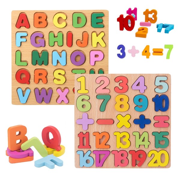 MisFun Pack of 2 Wooden Puzzles, Children's Wooden Grabbing Puzzle, Wooden Puzzle Numbers Letters Graphics, from 3+ Years, Children's Toy for Early Learning, Educational Games