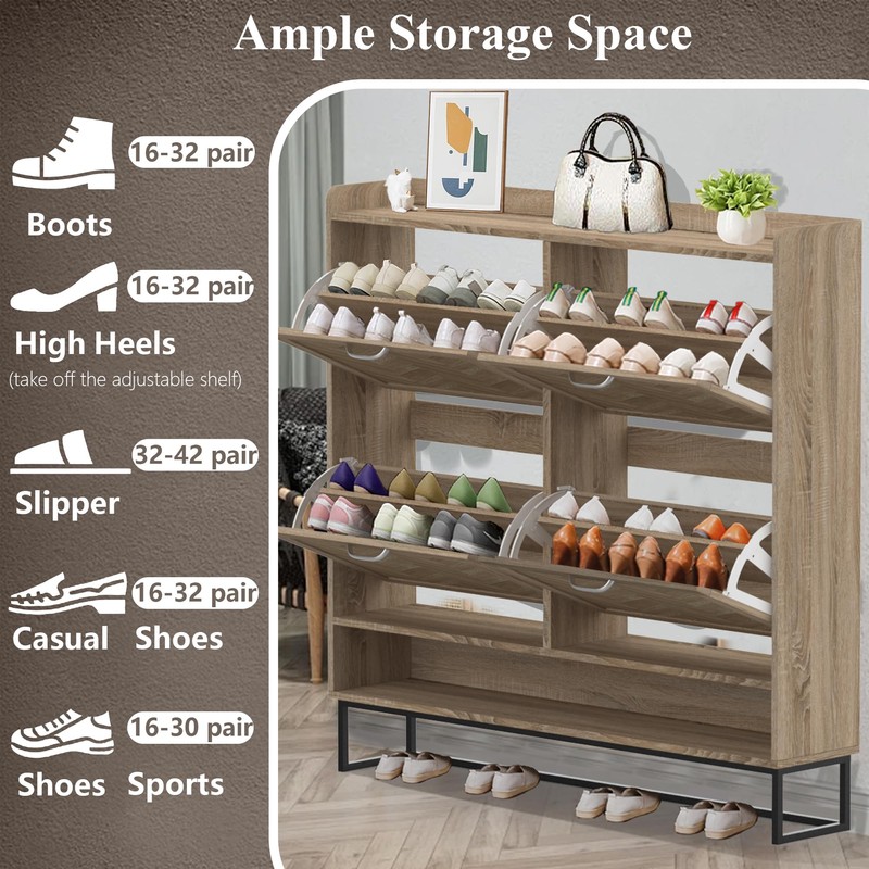 - 【Flip Drawers Shoe Cabinet】Our shoe rack cabinet with 4 flip drawers and 2 tiers inside each, each panel removable and adjustable in 2 grooves allowing customization based on shoe size or style from flats, mid boots or heels! It provides a convenient and organized solution for your footwear collection.
