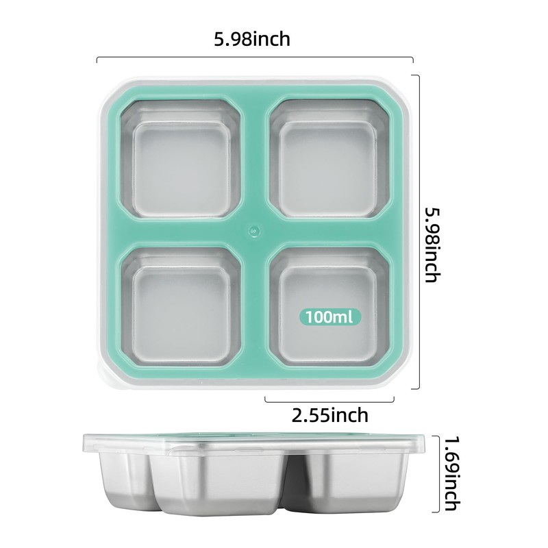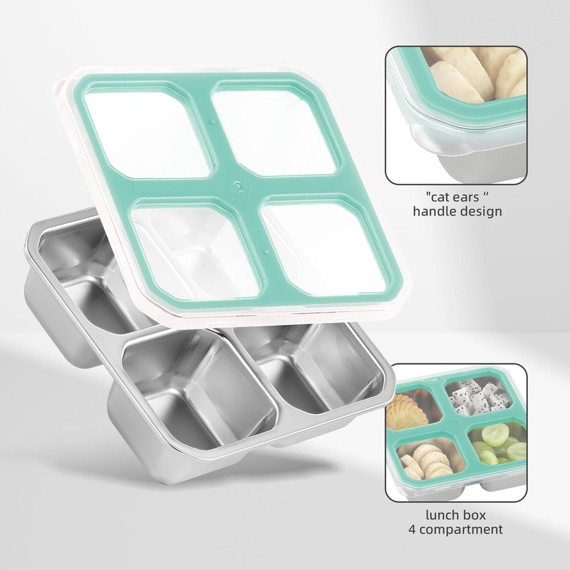 - Reusable Divided Snack Containers - The small 4-compartment stainless steel food container is made of food-grade 18/8 stainless steel with a BPA FREE lid. Sturdy, Eco-friendly, Long-last and Stackable. We can use reusable metal food containers to replace the disposable. Reducing waste, saving time and money.