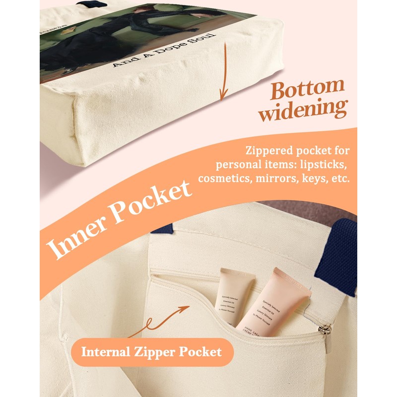 - Zipper Inner Pocket - This foldable canvas cloth bag designed with a inner zipper storage bag adds style and functionality and helps you to conveniently organize your daily small personal items: lipsticks, cosmetics, mirrors, keys, etc.