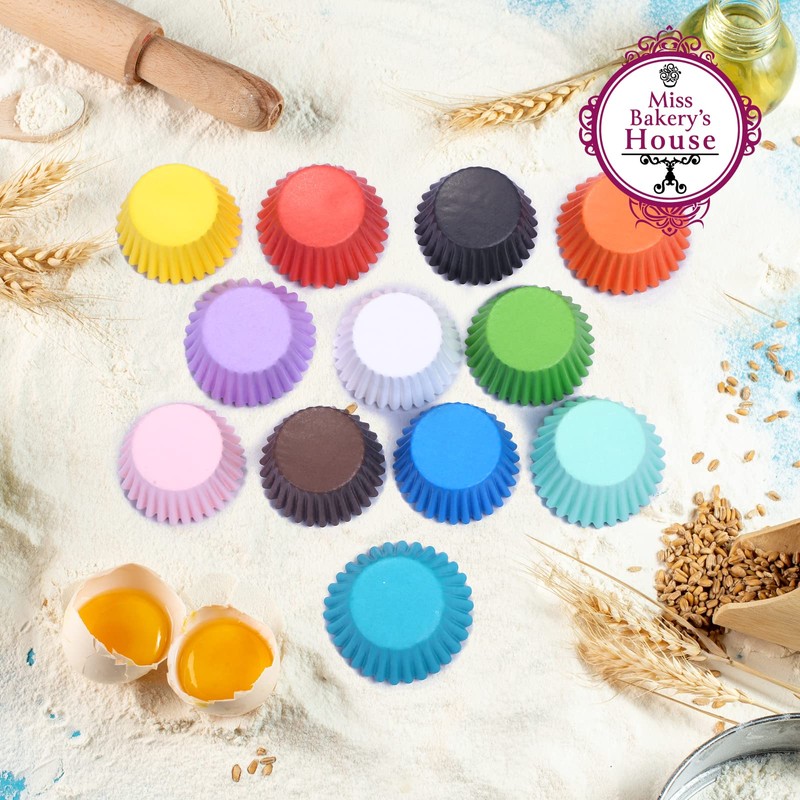 - SIZE:The paper baking cups are 100% food safe and baking proof and fit all standard size cupcakes & muffins. The size is diameter 50mm (base diameter) x 30mm (height) and there are 18 different colours to choose from: blue, dark blue, light blue, turquoise, brown, yellow, green, dark green, coral, purple, mint, orange, pink, purple, pink, red, black and white.