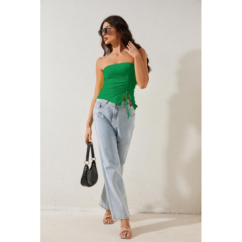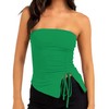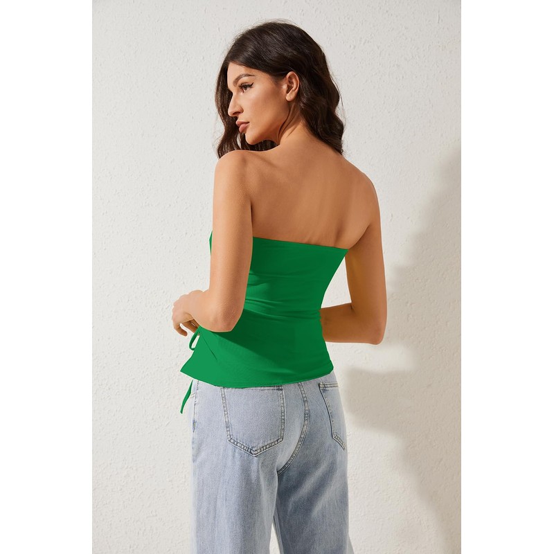 MISSACTIVER Women’s Strapless Sleeveless Tube Top Mesh Double Layer Ruched Side Asymmetrical Lace Up Bandeau Cami Tank Tops(Medium,Green)