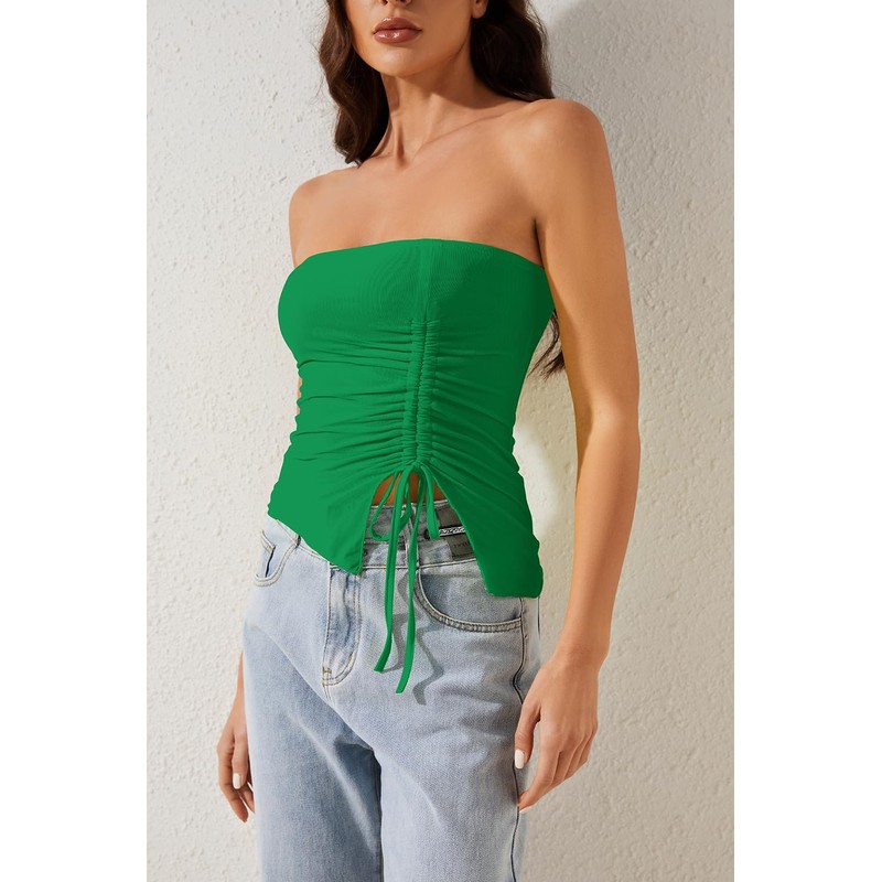 - Features: Strapless off shoulder bandeau tank tops, straight neckline, sleeveless, pleated ruched side, asymmetrical hem, drawstring, bandage lace up, solid color, slim fitted, double layer, casual mesh bandeau corset tops, cute and sexy camisole for teen girls and fashion women ladies.