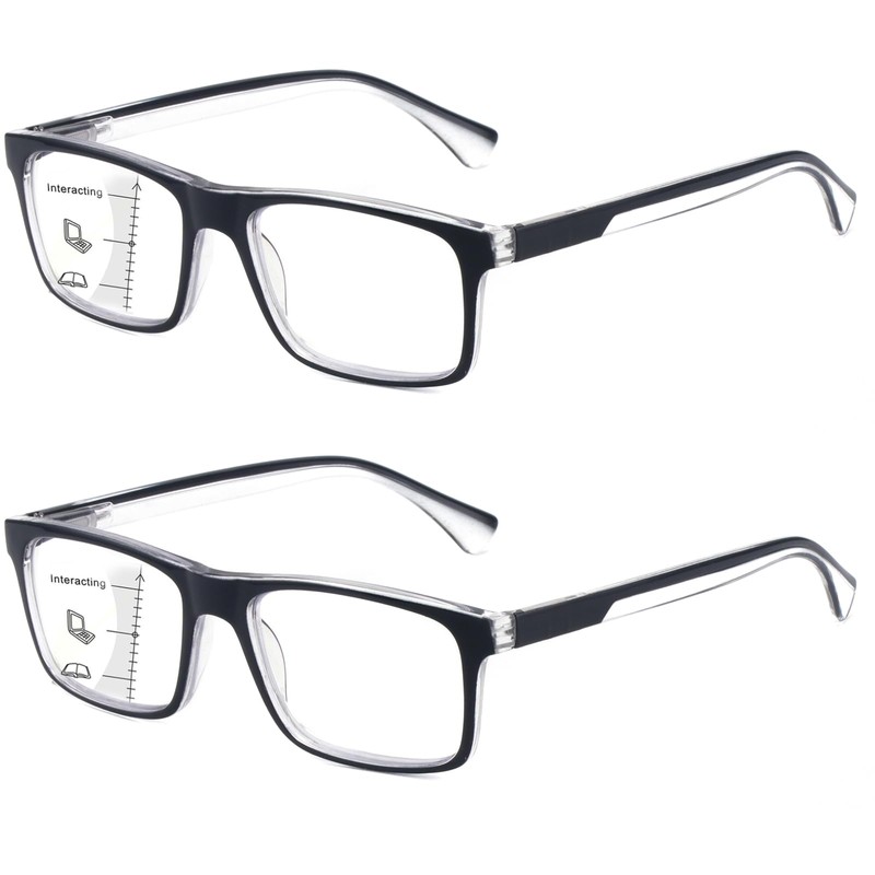 Missfive 2-Pack Mens Light Multifocus Progressive Reading Glasses Blue Light Blocking, Multifocal Spring Hinge No-Line Trifocal Readers Black Eyeglasses(Workspace For Near Range, 2.0)