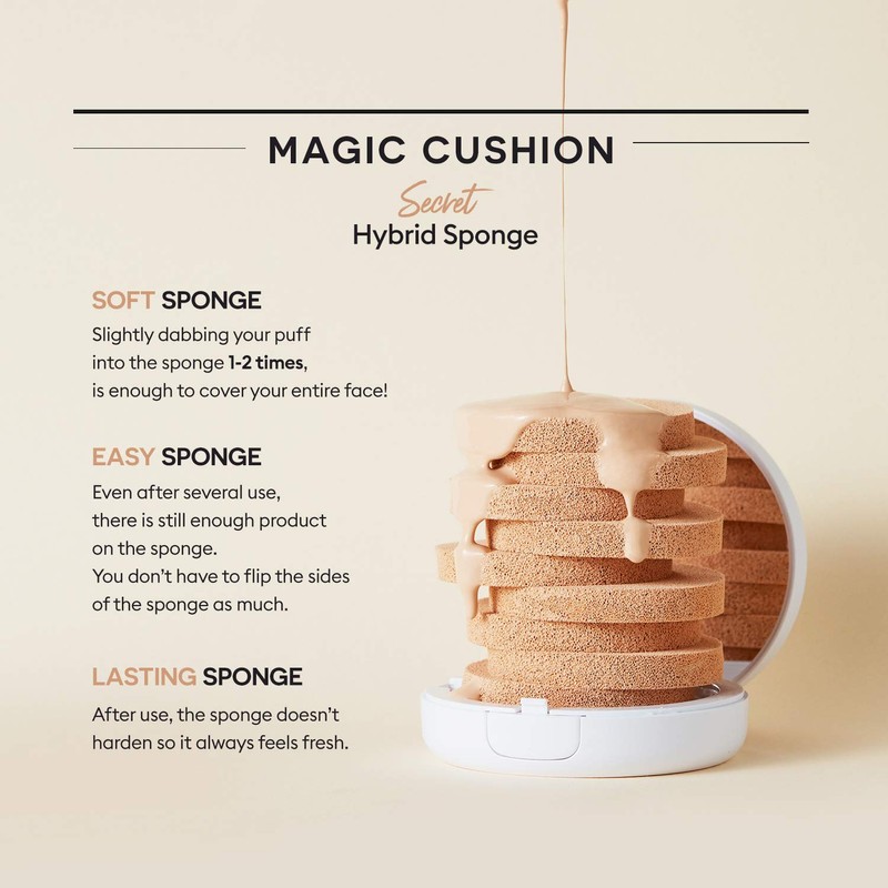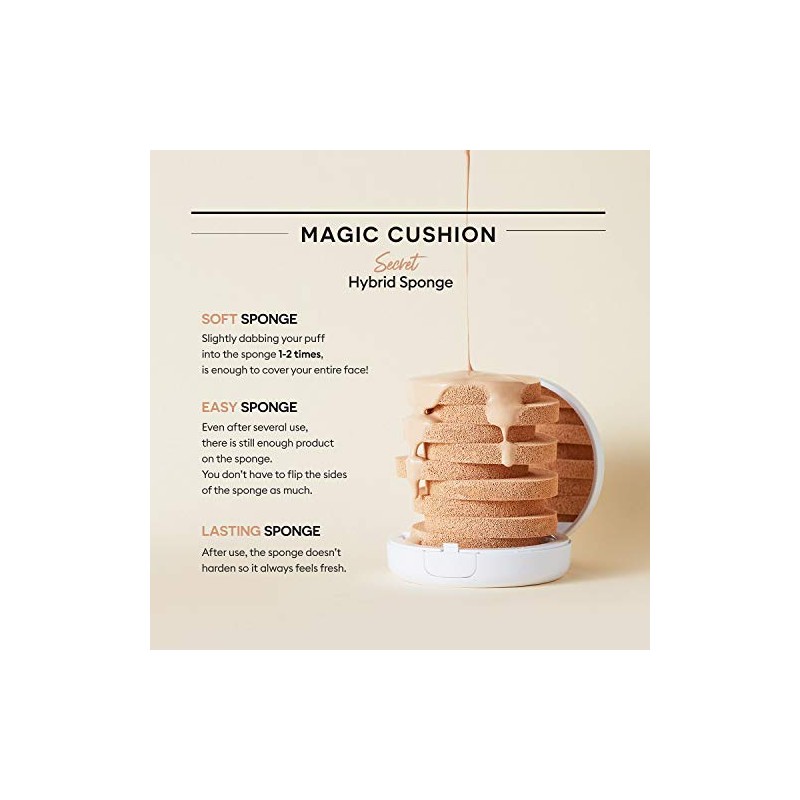 - IMPROVED ADHERENCE CUSHION: Magic fit powder is cleanly layered on top.